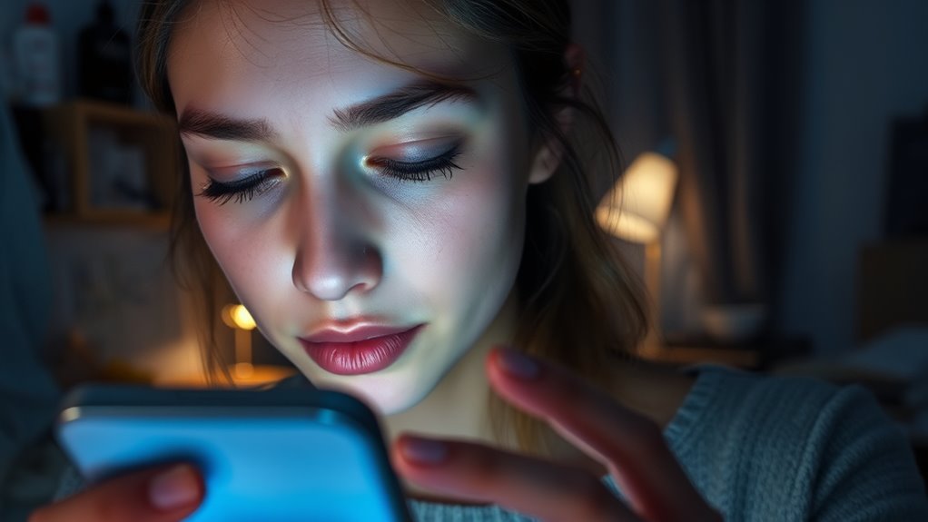 Exposing your skin to screens for long hours increases blue light exposure, which can speed up aging and weaken your skin’s barrier. It leads to dullness, redness, fine lines, and loss of elasticity. Over time, digital habits can cause dehydration and damage your skin cells. Protecting your skin with antioxidant products and taking breaks can help. Keep going to discover effective ways to combat digital effects and maintain a radiant complexion.