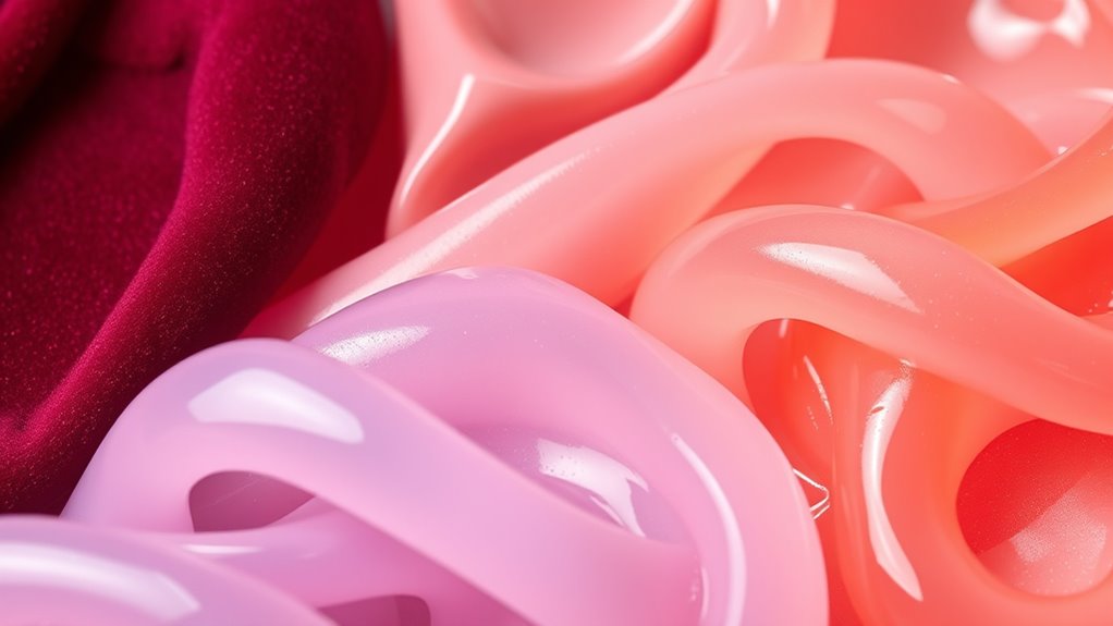 In 2025, velvet tints and jelly textures are leading makeup trends, helping you express boldness with a touch of fun and innovation. Velvet tints give your look a soft matte finish that’s rich yet understated, while jelly textures deliver a juicy, wet-look effect perfect for a fresh, youthful vibe. Combining these materials lets you play with dimension and vibrant color intensity. Keep exploring to discover how these textures can elevate your personal style effortlessly.