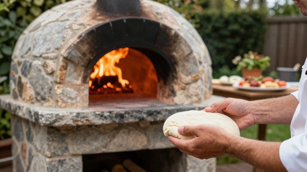 Yes, you can use pre-made dough in outdoor pizza ovens. Just make certain proper dough storage to keep it fresh and avoid dryness. You might also consider ingredient substitutions, like adding a bit of olive oil or flour if the dough feels too sticky or dry. Keep the dough at room temperature for easier handling, and don’t forget to adjust cooking time based on its thickness and consistency.