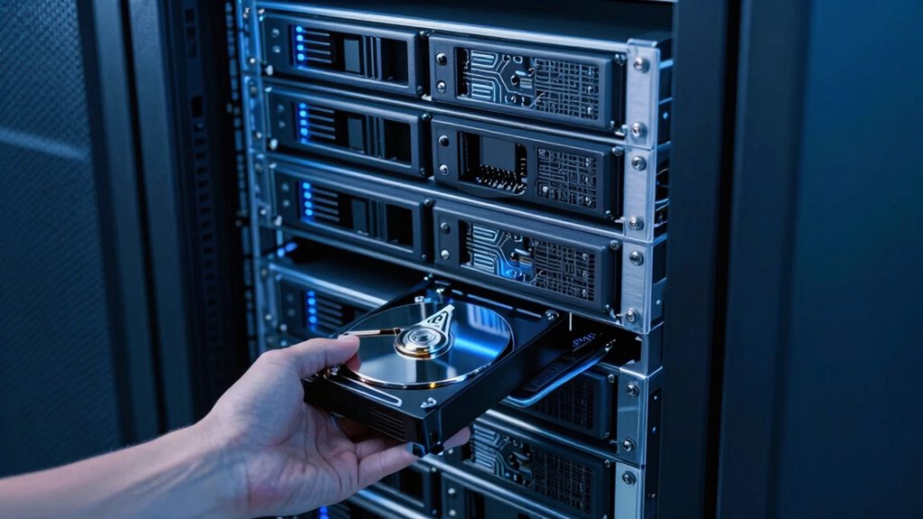 Backup storage protects against hardware failures through data redundancy, guaranteeing your data is copied across multiple drives or locations. This way, if one hardware component fails, your data remains safe and accessible from other copies. Additionally, hardware monitoring detects potential issues early, alerting you before failure occurs. This proactive approach minimizes data loss, keeps your systems running smoothly, and guarantees quick recovery, safeguarding your critical information from hardware-related disruptions.