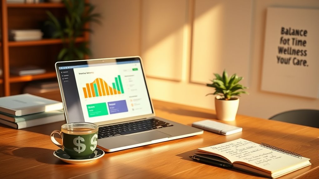 To start integrating wellness into your financial routine, focus on mindful spending by paying attention to your emotions and motivations behind each purchase. Practice emotional budgeting by setting aside funds for self-care and stress relief, making your finances work for your well-being. Track your spending regularly, reflect on how it makes you feel, and adapt as needed to guarantee your financial habits support both your goals and your mental health.
