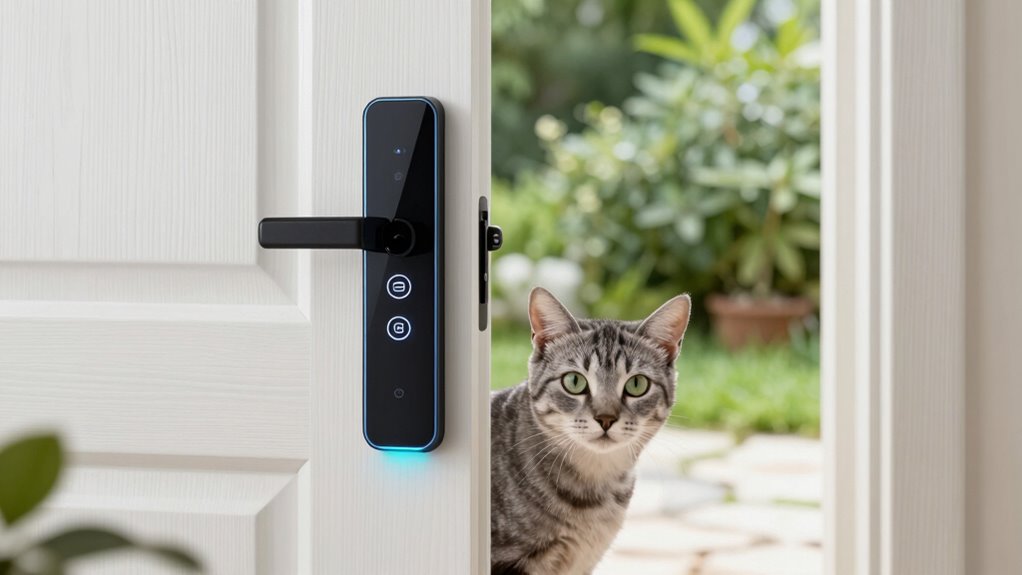 Smart pet doors include safety features like security sensors that detect your pet’s collar or RFID tag, preventing accidental locking out. They also offer an emergency release option, allowing you to manually open the door quickly if needed. These features guarantee your pet’s safety, giving you peace of mind knowing they won’t be accidentally locked outside and can be easily accessed in emergencies.