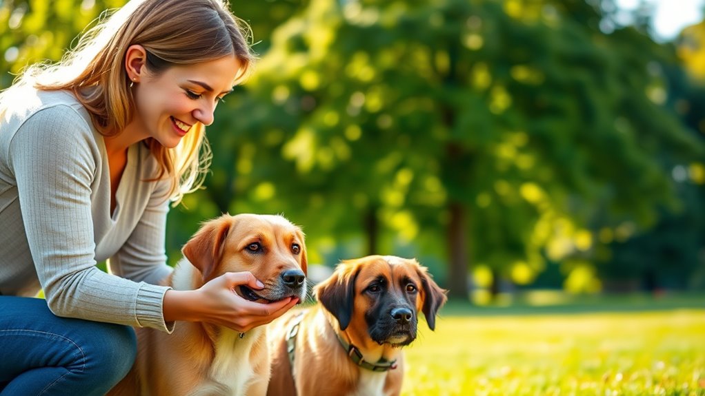 When socializing a rescue dog, start slowly and always prioritize patience. Use controlled environments like quiet parks to introduce new people and other animals gradually. Keep your dog leashed until you feel confident it can handle off-leash situations safely. Offer plenty of positive reinforcement with treats and praise, and avoid forcing interactions. Staying calm and consistent helps your dog build trust and confidence over time. Keep going, and you’ll discover even more effective ways to help your rescue thrive.