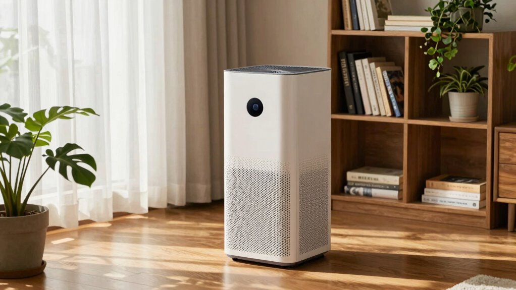 Don’t put your air purifier near electronic devices, or you’ll invite trouble. Electronic interference can disrupt its airflow, and device overheating could occur, hampering performance. Keep the purifier at a safe distance from computers, TVs, and chargers to guarantee it works effectively. Think of it as not throwing all your eggs in one basket—spread out your devices and purifier for the best air quality and device longevity.
