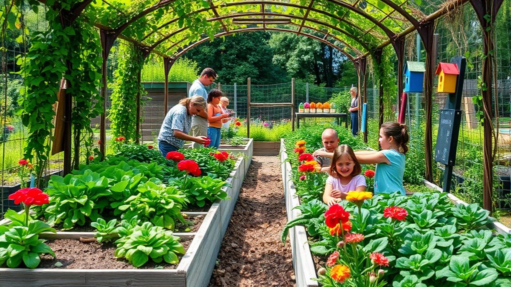Community gardens turn empty spaces into lively areas that boost neighborhood charm and bring people together. By growing fruits, vegetables, herbs, and flowers, you promote plant diversity and attract helpful insects while creating fresh food for your community. These gardens also foster social connections, encourage learning about sustainable practices, and strengthen collective pride. As you explore further, you’ll discover how these green spaces can truly transform your neighborhood and build lasting bonds.