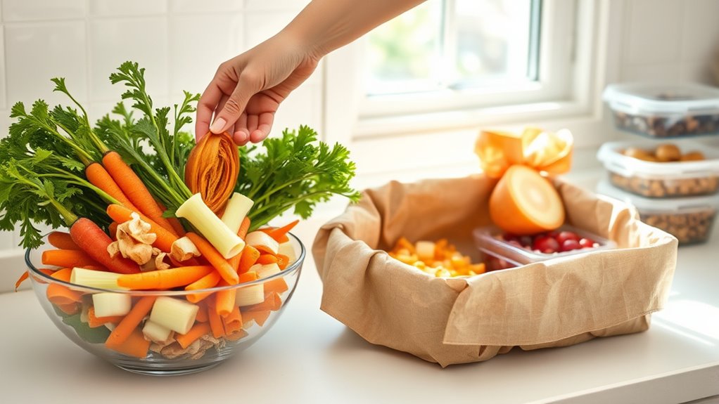 Imagine you’re a pioneer in composting tricks, turning scraps into treasure. To use food scraps creatively, try blending vegetable peels into smoothies or making broth from vegetable ends. You can also experiment with creative recipes like banana peel muffins or herb-infused oils. Composting tricks help reduce waste, while these ideas give your leftovers a second life, saving money and helping the environment while satisfying your culinary curiosity.