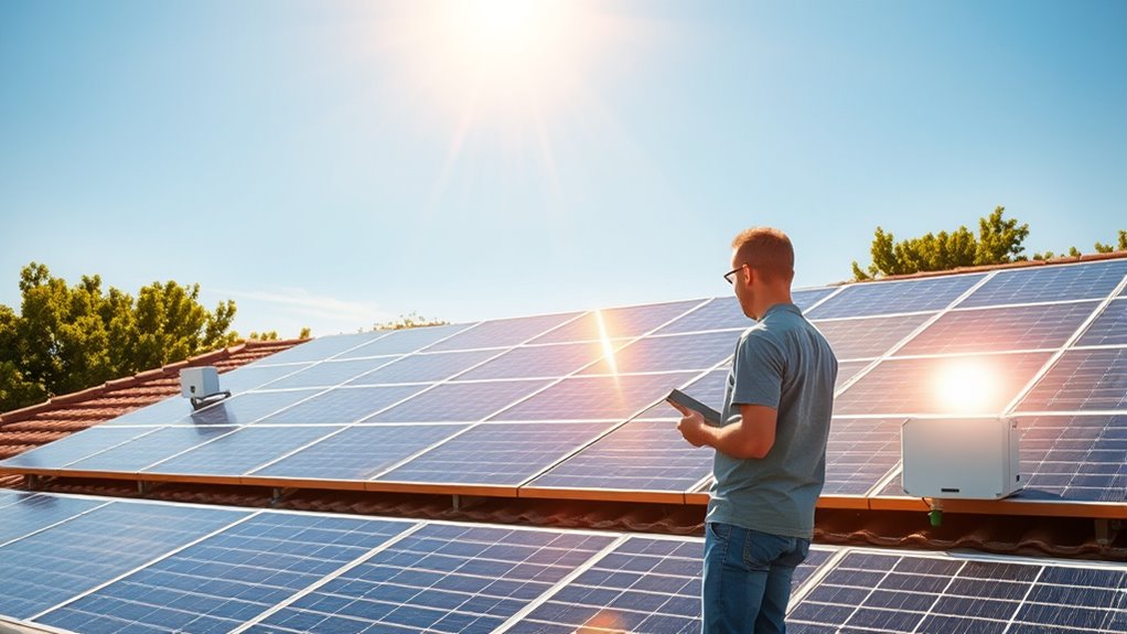 To start harnessing the sun at home, you first need to assess your roof’s suitability — its size, orientation, and shading. Once you determine your location’s solar potential, you can work with a professional installer to design a system tailored to your energy needs. They’ll help you select high-quality solar panels and storage options that fit your budget and goals. After installation, focus on ongoing solar panel maintenance to sustain peak performance. This includes regular cleaning and inspections, especially after storms or heavy dirt accumulation. Maintaining your system ensures it produces the expected amount of energy, saving you money over time. Proper system maintenance can help extend the lifespan of your solar setup and optimize its performance.