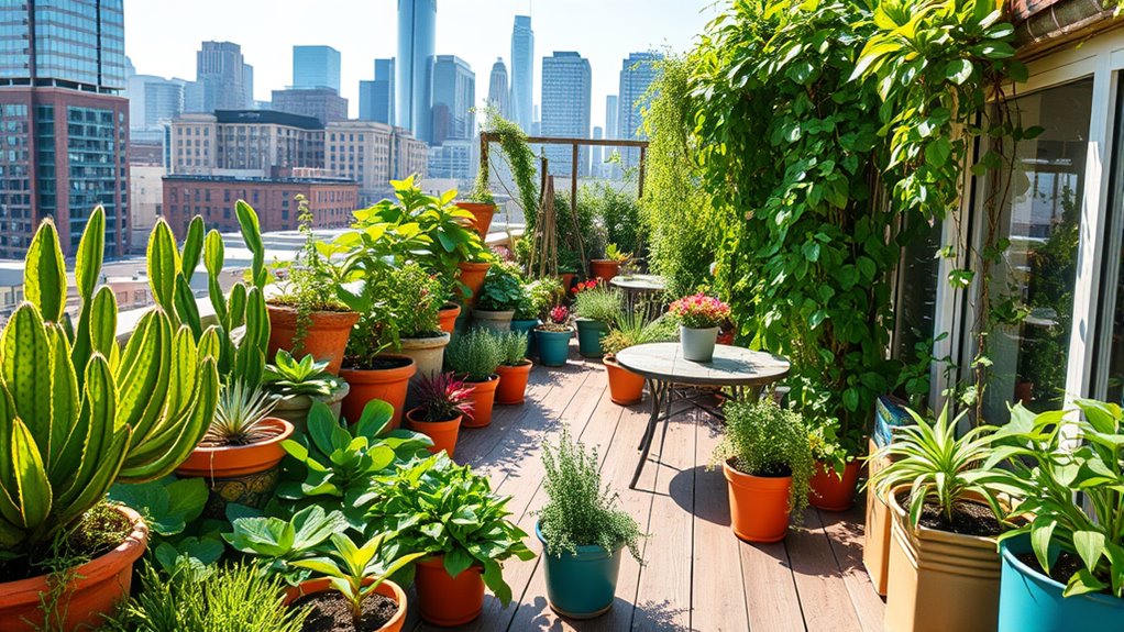 To create thriving rooftop and balcony gardens, focus on vertical farming techniques like wall-mounted planters and vertical containers to maximize your limited space. Use community composting to naturally nourish your plants and promote sustainability. Choose compact plants such as herbs, leafy greens, and strawberries that grow well in small footprints. Elevate your gardening game by combining these methods and exploring innovative ideas—more tips await to help you turn your small space into a lush oasis.