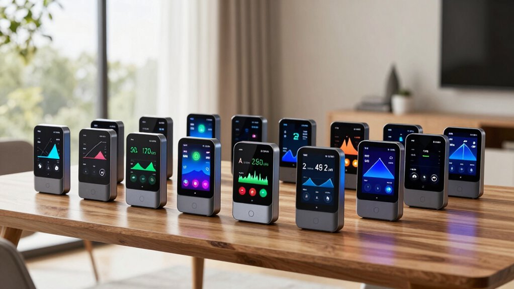 Choosing the right smart air quality monitor hinges on understanding its key measurement parameters, which reveal the device’s ability to accurately detect and report airborne pollutants. Essential factors include measurements of PM2.5, CO2, VOCs, formaldehyde (HCHO), temperature, and humidity. High-quality sensors, such as NDIR for CO2, electrochemical for gases like CO and HCHO, and laser-based sensors for particulate matter, ensure precise readings. The measurement range and accuracy, like ±15 µg/m³ for PM2.5 or ±50 ppm for CO2, determine how well the device performs in different environments. Real-time monitoring with quick refresh rates, typically every 2-5 seconds, helps identify sudden changes. Some monitors also track air pressure and AQI, delivering a comprehensive view of indoor air quality.