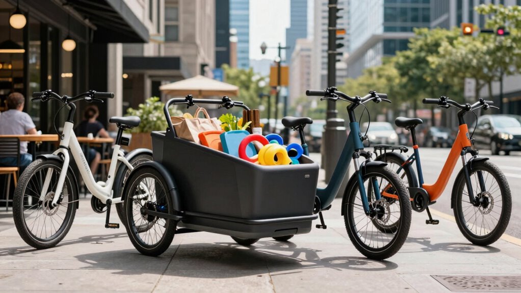 Looking for the best cargo electric bikes in 2026 to transport groceries and kids? I’ve found top models with powerful motors, long-range batteries, and sturdy frames that handle heavy loads easily. Features like foldable trailers, waterproof baskets, and secure child seats make these bikes perfect for everyday errands. They’re safe, versatile, and designed for comfort. Keep exploring, and you’ll discover everything you need to choose the perfect cargo e-bike.