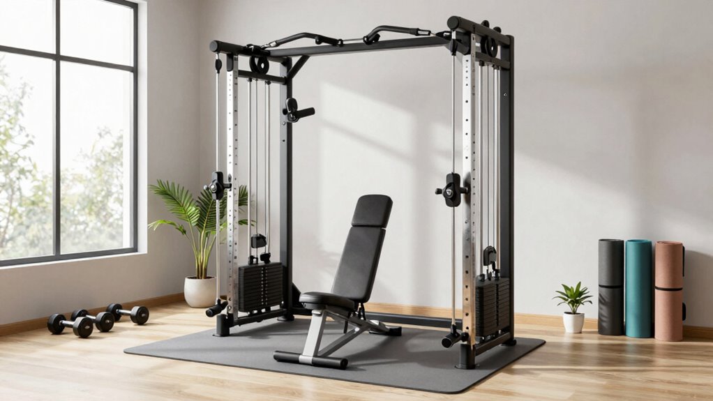 Choosing the right compact home gym system can transform your fitness routine, saving space and money. Did you know that over 60% of home gym buyers prioritize versatility and size? With options like adjustable benches and resistance cables, there’s something for everyone. Remember, investing in a system that fits your goals and space guarantees you’ll stay motivated and consistent. Start your fitness journey today—your future self will thank you!