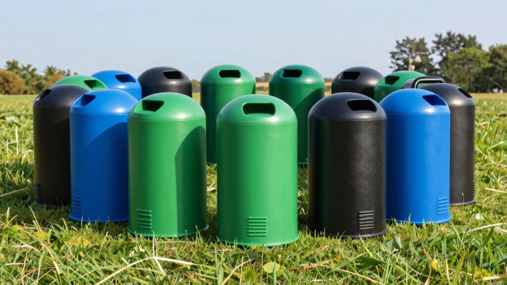 Ease of use is a key factor that can make or break your composting experience. A smooth, 360-degree rotation system with built-in handles or fins requires minimal effort, making turning effortless. Quick assembly, with clear instructions and pre-assembled parts, helps beginners get started without frustration. Features like large access doors, removable panels, and ergonomic grips simplify adding waste and removing finished compost. Vents and aeration slots should be designed for easy airflow management, eliminating the need for complex adjustments. Additionally, a lightweight or balanced design reduces physical strain, allowing users of all strength levels to operate the tumbler comfortably. Keeping these factors in mind guarantees your composting process is straightforward, efficient, and enjoyable from start to finish.