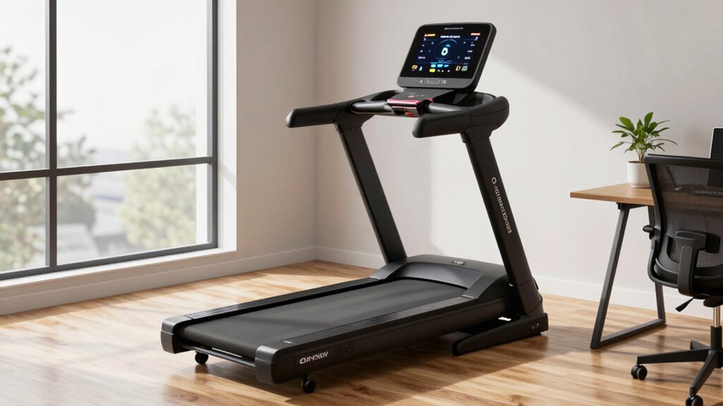 A quiet motor is essential for maintaining a peaceful environment, especially if you plan to work or exercise early in the morning or late at night. Look for treadmills with a decibel rating below 45 dB, which indicates a quieter operation suitable for home or office. Brushless motors tend to produce less noise than brushed motors, offering a more peaceful workout experience. Keep in mind that noise levels can increase with higher speeds, so choosing models with sound insulation or anti-vibration features is smart. Advanced motor technology, like soundproofing, can considerably reduce operational noise. A consistently quiet motor minimizes disturbances, making your workouts less disruptive for you and others around you. Prioritizing noise level ensures a more comfortable, focused environment.