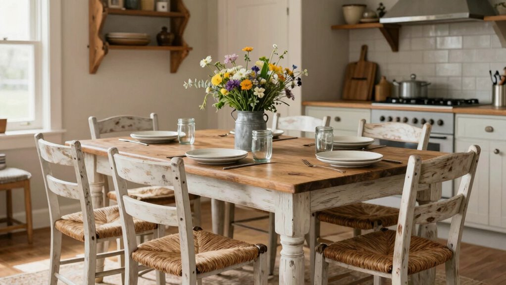 Did you know that farmhouse dining sets often see more wear and tear due to their rustic finishes? I’d say no, they don’t require special cleaning products. Regular mild soap and water usually do the trick, protecting the natural wood or distressed paint. Just avoid harsh chemicals to keep that charming, aged look intact. Cleaning with gentle solutions guarantees your farmhouse set stays beautiful and durable for years.
