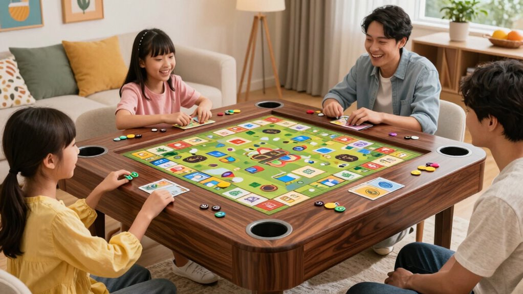 Multi-functionality features are essential in family board game tables with cup holders because they enhance versatility and convenience. These tables often let you switch easily between gaming and dining modes, thanks to removable or foldable surfaces. Many come with dedicated storage compartments, like sliding trays and hidden shelves, to keep game pieces, snacks, and drinks organized and within reach. Integrated cup holders help prevent spills and keep beverages close without cluttering the surface. Some tables even feature dual-sided surfaces or interchangeable panels, allowing use for puzzles, crafts, or meals. The ability to transform the table effortlessly and access different features guarantees a seamless experience, making your family gatherings more enjoyable and clutter-free. Multi-functionality truly maximizes a table’s utility.