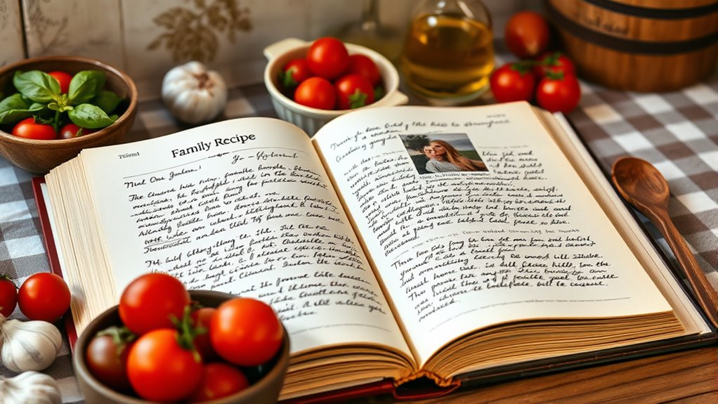 To personalize a family recipe book, I start by adding stories behind each dish, making it special. I include photos, handwritten notes, and family anecdotes to reflect our culinary traditions. I also leave blank spaces for future recipes or modifications, ensuring it evolves with us. By combining these personal touches, my recipe book becomes a heartfelt keepsake that truly represents our family’s unique flavors and history.