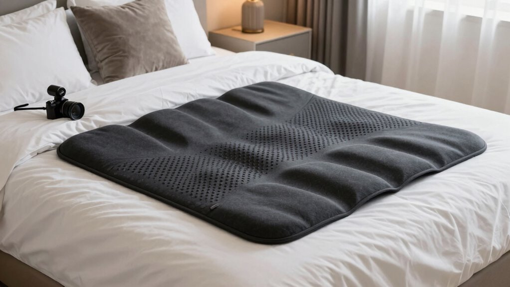 Choosing a massage mat for your bed means considering the variety of techniques it offers, as each targets muscles differently to provide personalized relief. Vibration massage delivers gentle, rhythmic pulses that relax muscles without deep pressure, making it ideal for sensitive users. Shiatsu and kneading techniques mimic human massage by applying deep, circular pressure to specific points or areas, offering more targeted relief. Airbag stretching and twisting functions create traction and elongation, which can improve flexibility and reduce tension. Some mats combine multiple techniques, allowing you to customize your experience based on your preferences and muscle needs. Whether you prefer gentle vibrations or deep, therapeutic pressure, selecting a mat with versatile techniques guarantees you get the most effective, tailored massage every time.
