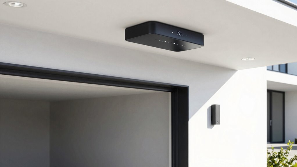 A stable power supply is vital for a smart garage door opener to operate reliably, whether it’s wired directly into your home’s electrical system or plugged into a dedicated outlet. Consistent power ensures smooth functioning of remote controls and automation features. Backup power options, like battery backups or uninterruptible power supplies (UPS), are essential for maintaining access during outages. Some openers come with integrated batteries that automatically activate when main power is lost, allowing you to open or close your garage remotely. The capacity of the power supply and backup features directly impact the security and dependability of your system. Guaranteeing compatibility with backup solutions prevents inconvenient lockouts and keeps your garage secure, even during electrical failures. Reliability depends heavily on your power setup and backup options.
