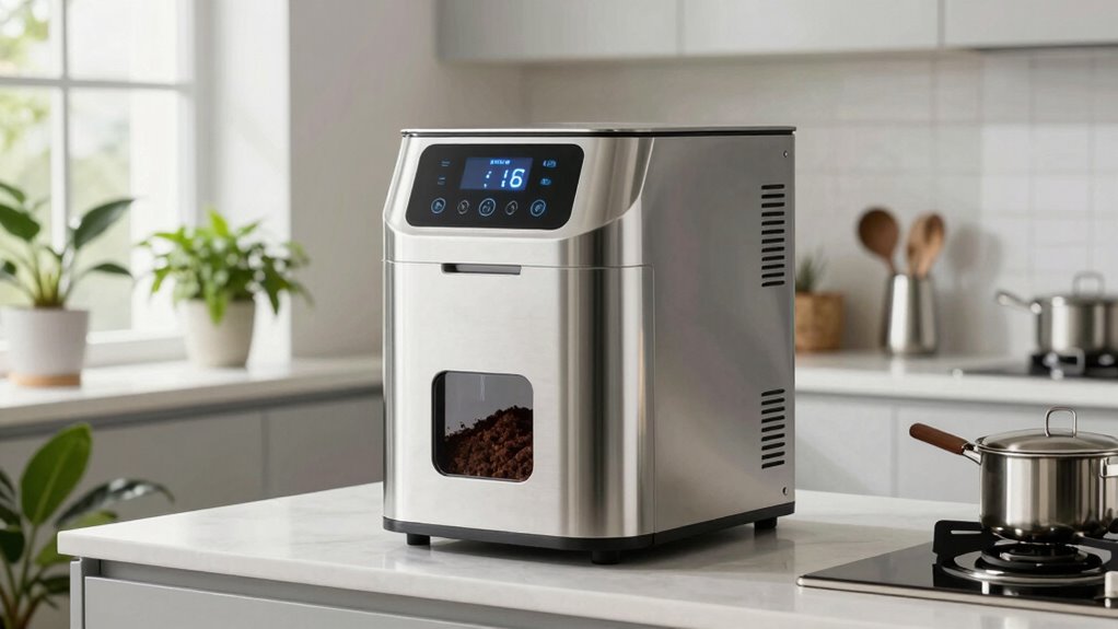 Maintaining a high-capacity indoor composting machine requires paying attention to its cleaning and filter replacement routines, which can substantially impact performance and odor control. Machines with auto-cleaning features reduce manual effort, often only needing filter replacements every few months. Automated cleaning cycles help prevent residue buildup, keeping the system hygienic and efficient. Regularly replacing odor-control filters—every 90 to 180 days—is essential to maintain effective odor neutralization. Choosing a machine with durable, dishwasher-safe components simplifies cleaning and extends internal parts’ lifespan. If the unit uses microbial or enzymatic additives, consistent maintenance of these components guarantees maximum composting efficiency and prevents foul odors. Proper upkeep not only prolongs the machine’s lifespan but also guarantees consistent, hassle-free operation.