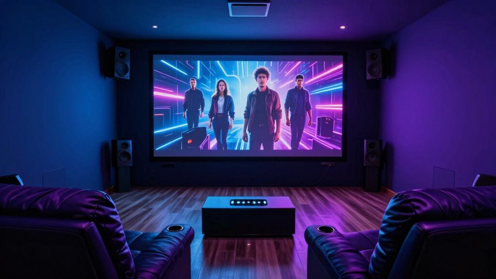 Maintenance for these advanced home theater systems isn’t complicated. I regularly dust the equipment and check connections to guarantee everything runs smoothly. Firmware updates are essential and usually straightforward, keeping systems up-to-date. I also schedule annual professional checkups to fine-tune audio and visuals. Proper ventilation prevents overheating, and I avoid exposing components to extreme temperatures or humidity. With some simple upkeep, my home theater stays impressive and reliable.