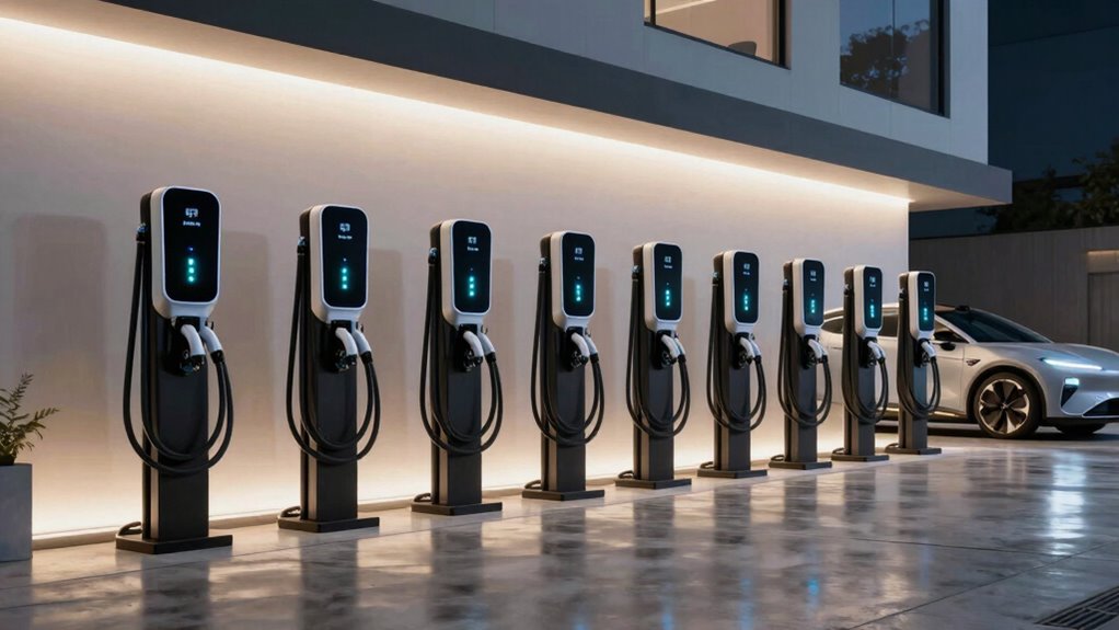 Smart features have become an essential factor in selecting a Level 2 EV charger for your home garage because they offer enhanced convenience and control. With WiFi-enabled chargers, you can monitor and manage charging sessions remotely through mobile apps, providing real-time updates and easy adjustments. Scheduling options let you optimize charging during off-peak hours, saving money on electricity costs. Firmware updates via WiFi guarantee your charger stays current with the latest features and security improvements. Many apps also allow you to customize current settings, start or stop charging, and review your charging history and energy consumption. Additionally, integration with smart home systems can streamline automation, making energy management more efficient and seamlessly fitting into your daily routines.