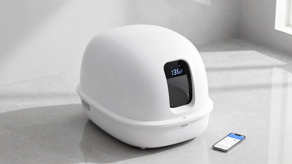 Think of app-connected litter boxes like a guarded castle—security depends on the fortress. I find that reputable brands use strong encryption and regular updates, making data breaches less likely. Still, no system is foolproof. I suggest choosing models with transparent privacy policies and robust security features. By staying informed and cautious, I can enjoy the convenience without risking my data privacy.