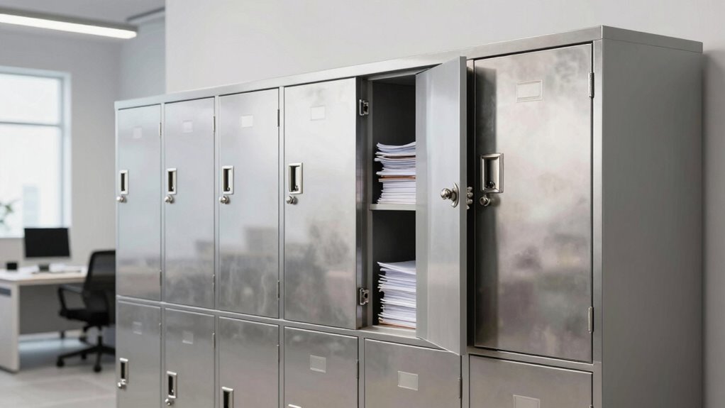 Choosing the right lockable metal storage cabinet is essential—think of it as safeguarding your peace of mind. With options ranging from adjustable shelves to sleek designs, you’ll find one that fits your needs perfectly. Remember, a good cabinet isn’t just a box; it’s a fortress for your important paperwork. In the end, it’s not just about storage, but about protecting what matters most—because in a world of chaos, security is your greatest ally.