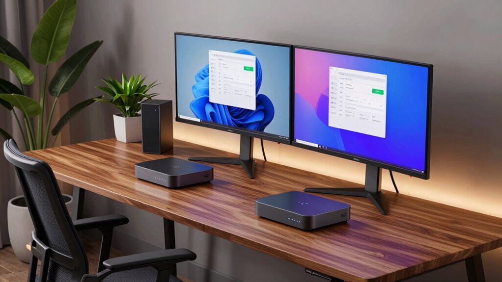 Ever wonder how much your budget impacts your mini PC options for a dual monitor home office setup? Setting a clear budget helps narrow down choices and prevents overspending on features you don’t really need. Mini PCs range from affordable models around $200 to premium configurations over $1000, which means your budget directly influences available specs. Prioritizing essential features within your budget ensures you get solid performance for dual monitors without wasting money on unnecessary extras. Keep in mind, budget constraints might limit upgradeability, affecting long-term use and compatibility with future accessories. Comparing cost versus performance helps find the most cost-effective mini PC that meets your home office needs. Staying within your budget guarantees you get the best balance of affordability and functionality.