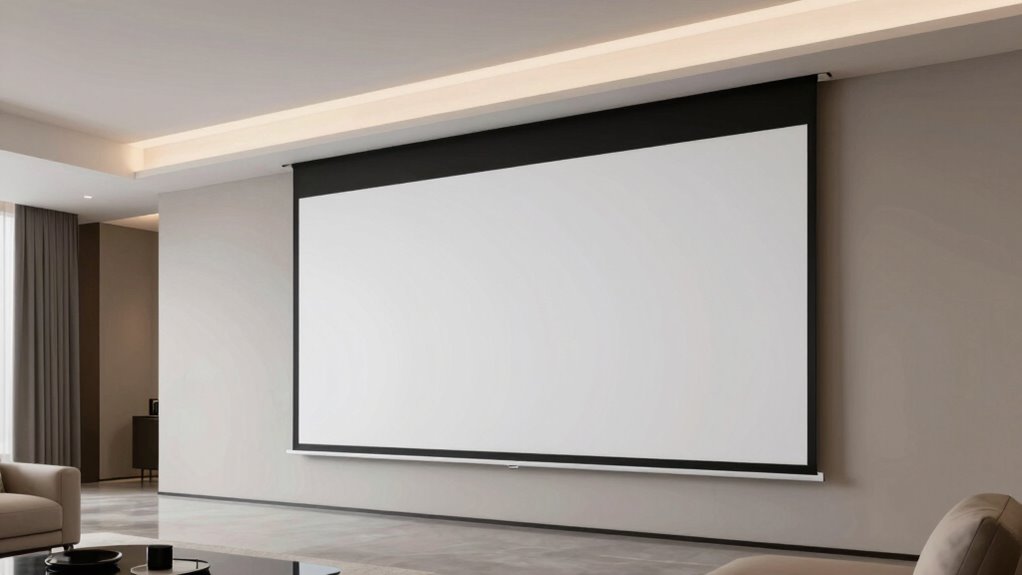 Imagine a sleek, motorized screen gently descending, transforming your space into a cinematic haven. With the right choice, your movies will come alive against a crisp, vibrant backdrop, whether indoors or out. These top picks guarantee effortless setup and stunning visuals, making every movie night feel like a personal theater experience. So, pick the one that fits your space and style, and get ready for countless unforgettable movie marathons.