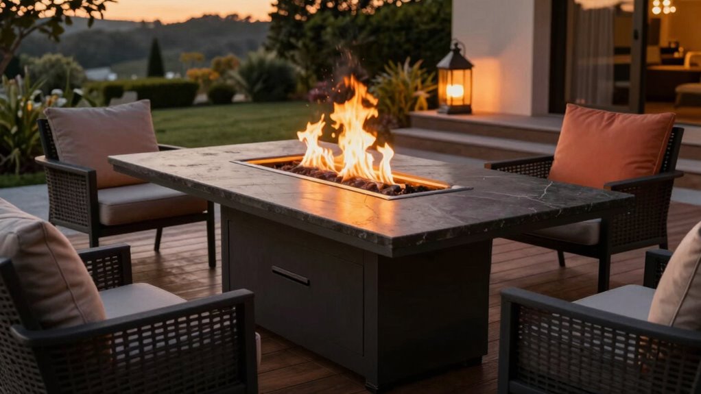 Are you looking to keep your outdoor space comfortably warm during chilly evenings? Then, focus on a fire pit table with at least 50,000 BTUs of heating power. This level of heat guarantees your gatherings stay cozy, even when temperatures drop. Adjustable flame control is also essential—it lets you customize both heat output and ambiance, creating the perfect atmosphere for any occasion. Look for models with reliable ignition systems, whether electronic or manual, so lighting the fire remains hassle-free, especially in windy conditions. Safety features like shutoff mechanisms are vital for peace of mind during use. Some fire pit tables even offer multi-colored or variable flame settings, adding visual appeal while providing versatile heating options.