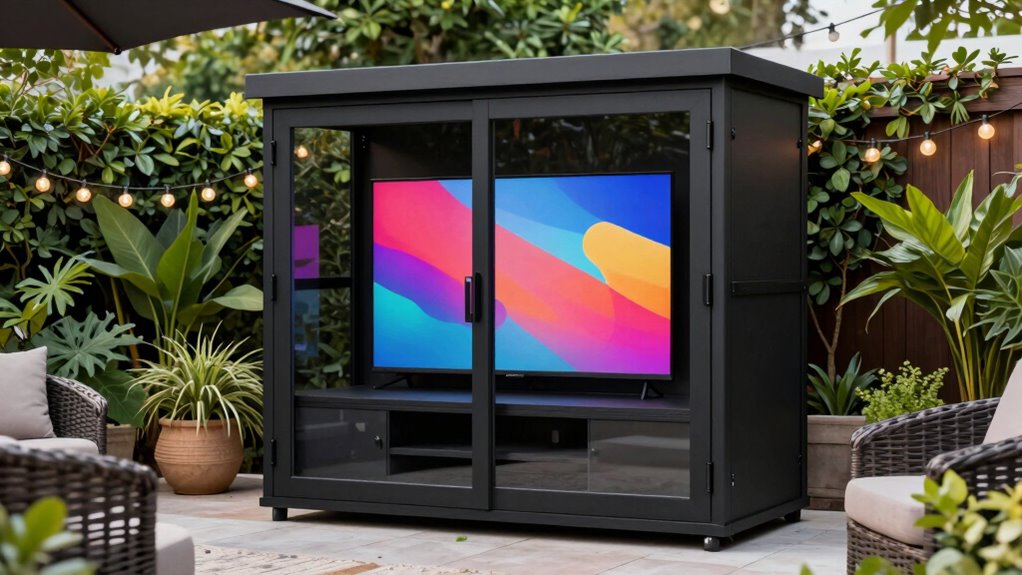 Selecting the right materials for an outdoor TV enclosure is essential to guarantee durability and long-term performance. I look for materials like impact-resistant plastic, waterproof metals, or treated wood, which can withstand rain, snow, and UV rays. UV-resistant coatings or additives are crucial because they prevent cracking and degradation caused by sun exposure. I also prioritize impact-resistant options such as ABS plastic or sealed metal alloys to protect against physical impacts and environmental wear. For humid or salty environments, corrosion-resistant finishes like powder-coated steel or anodized aluminum are vital for longevity. Ultimately, choosing materials that balance durability with weight and aesthetic appeal ensures that my enclosure not only offers protection but also complements the outdoor space beautifully.