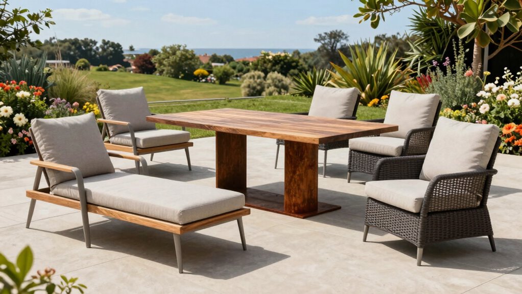 Selecting a weatherproof patio furniture set involves paying close attention to key features that enhance durability and resistance to the elements. Look for materials like all-weather wicker, PE rattan, or treated metal that resist moisture, UV rays, and temperature swings. Cushions should be made with quick-drying, water-repellent fabrics such as Olefin or polyester, with removable covers for easy cleaning. Frames built from powder-coated steel, aluminum, or rust-proof materials prevent corrosion and prolong their lifespan. Protective coatings like UV-resistant powder finishes or waterproof sealants add extra durability and help maintain appearance over time. Design elements such as water drainage holes and sealed joints are essential—they prevent water buildup, reduce damage, and guarantee your furniture stays resilient through seasonal weather changes.
