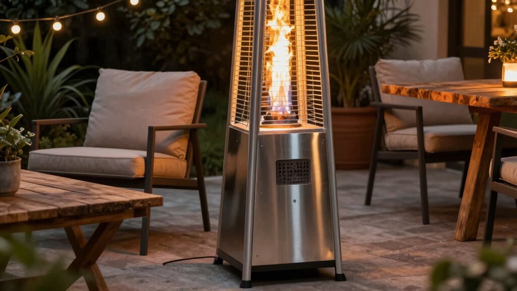 Choosing a propane patio heater built from durable materials is essential for ensuring it withstands the outdoor elements over time. I look for heaters made from high-quality, corrosion-resistant materials like stainless steel or powder-coated aluminum, which resist rust and decay. Durable components, such as double-layer burner meshes and weatherproof finishes, help the heater endure rain, snow, and UV rays. Safety features like rust-resistant guards and impact-resistant casings also boost longevity and safety. Additionally, I prefer heaters with sturdy bases or weighted tanks to prevent tipping in windy conditions, extending their lifespan. Regular maintenance and inspections of these durable materials keep the heater performing well and prevent rust, corrosion, or damage that could impair its efficiency over time.