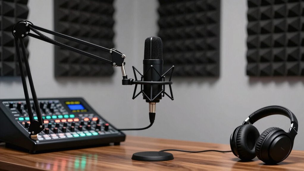 Achieving professional-quality audio starts with understanding the key standards that define sound clarity and fidelity. A high-quality podcast kit delivers a clear, natural sound with minimal distortion and background noise. Microphones with a cardioid pattern help by focusing on your voice and reducing ambient sounds. A wide frequency response, typically from 40Hz to 16kHz, ensures your vocal tones are accurately reproduced. The signal-to-noise ratio (SNR) should be above 60 dB, providing cleaner audio with less unwanted noise. Additionally, a top-tier audio interface with high-quality preamps and onboard processing enhances overall sound fidelity. By prioritizing these standards, you ensure your recordings sound professional and engaging, setting your podcast apart in a competitive landscape.