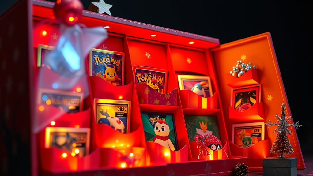 I’ve seen holiday calendars themed after iconic Pokémon regions like Kanto, Johto, and Galar, making each day feel like a mini adventure through vivid lands. These calendars burst with region-specific cards and artwork, transforming your holiday countdown into a journey across the Pokémon universe. It’s like opening a tiny portal to your favorite region every day, sparking excitement and nostalgia with every surprise!