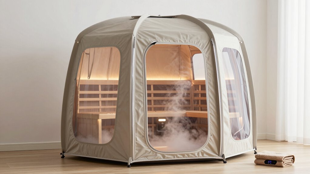 If you’re thinking about bringing a portable steam sauna into your home, I’ve seen firsthand how it transforms relaxing routines. Imagine Sarah, who relieved her chronic stress with her compact sauna, or a friend who improved her skin health after regular sessions. With so many options, choosing the right tent depends on your space and needs. I encourage you to pick one that fits your lifestyle—you’ll be surprised how much a little steam can boost your well-being!