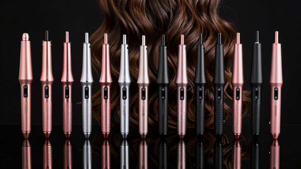 Choosing the right barrel size is essential for achieving the look you want with long hair. Larger barrels, like 1.25 inches or more, are perfect for creating loose, voluminous waves that cascade beautifully down long locks. If you’re after tight curls or detailed styling, smaller barrels, such as 0.35 or 0.5 inches, are ideal. Tapered barrels offer versatile styling, letting you achieve tight curls at the ends and loose waves at the roots. Extended barrels, usually 2 inches longer, make styling long hair quicker and easier, especially when reaching the roots. Interchangeable sets with multiple barrel sizes give you maximum flexibility, letting you switch styles effortlessly. Picking the right size depends on your desired look and hair texture, making barrel options a vital factor.