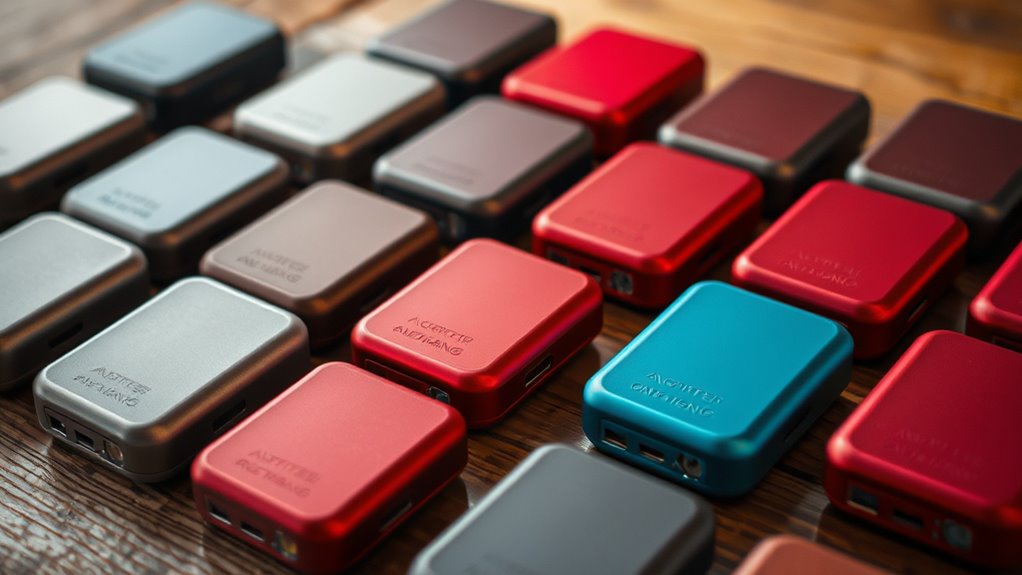 When selecting a rechargeable hand warmer, portability and design are essential factors that can markedly enhance your experience. I look for compact, slim models that easily fit in pockets, gloves, or bags, making them perfect for outdoor activities and daily commutes. Features like lanyards, magnetic attachments, or foldable structures add versatility, allowing me to carry and use them conveniently in different situations. Durability is also key—materials like aluminum or high-grade plastics ensure they withstand daily wear without adding unnecessary weight. An ergonomic shape with simple controls helps me handle them easily and access warmth quickly. Overall, a well-designed, lightweight hand warmer that balances functionality with portability makes all the difference when staying warm on the go.