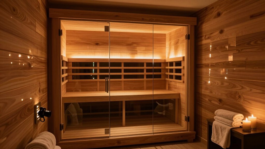 Beyond safety features, many infrared saunas now include additional wellness options that can enhance your overall experience. For example, red light therapy with specific wavelengths like 660nm helps improve skin health, ease muscle tension, and support cellular regeneration. Chromotherapy lighting offers multiple color options to boost mood and relaxation during your session. Some models come with built-in MP3 or Bluetooth systems, so you can listen to music or guided meditations, enhancing mental well-being. Air purification is also common, with oxygen ionizers that improve respiratory health and create a cleaner environment inside the sauna. Advanced models may have dual control panels, allowing you to customize red light, chromotherapy, and sound settings for a personalized, holistic wellness routine.