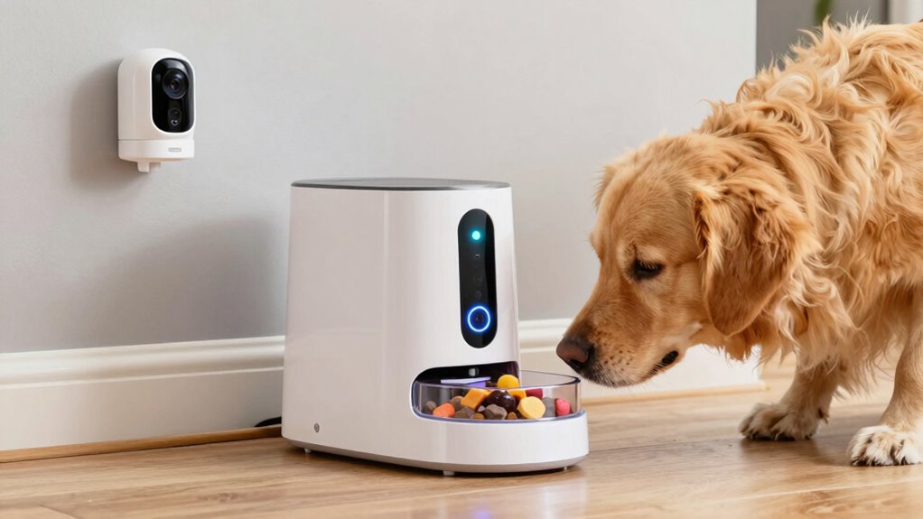 Choosing a smart dog treat dispenser with high-quality camera features is essential for effective pet monitoring and training. A high-resolution camera, like 1080p or higher, ensures you see every detail clearly, making it easier to observe your pet’s behavior. Night vision capabilities, including infrared technology, let you monitor your dog in low-light or dark conditions without disturbing them. A wide-angle lens, ranging from 110° to 360°, provides thorough coverage of the room, so you won’t miss anything. Features like auto-tracking and pan-tilt functionality keep your pet in focus and give you dynamic viewing angles. Ultimately, clear video streaming with minimal lag and high frame rates ensure real-time communication, making supervision seamless and effective.