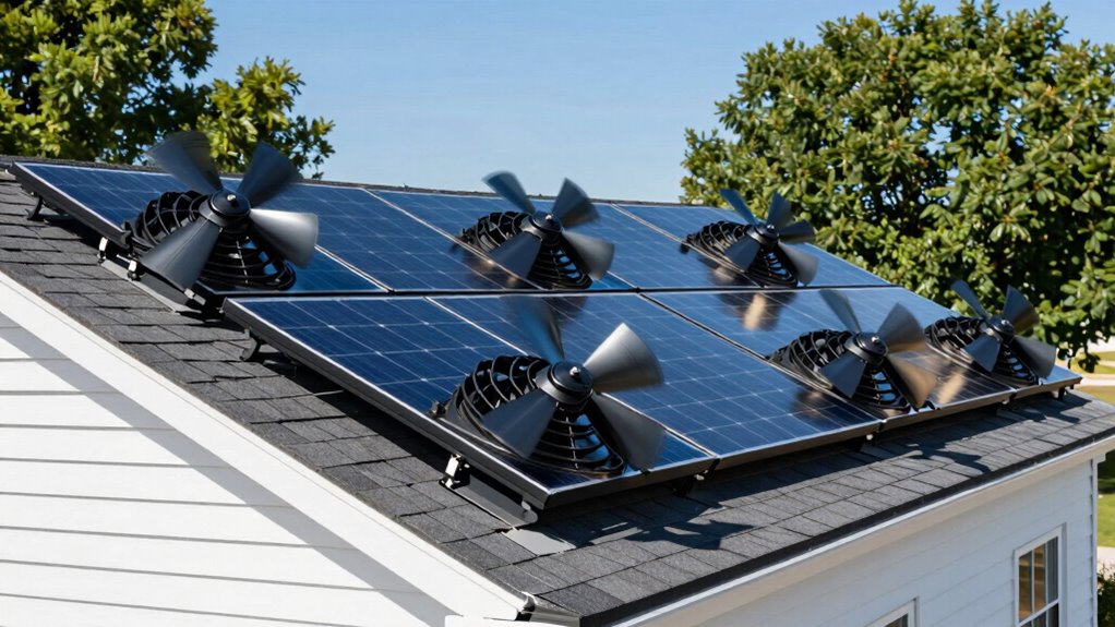 I find that solar attic fans do require some maintenance, but it’s minimal. I regularly check the solar panels for dirt or debris to guarantee they operate efficiently. Occasionally, I inspect the fan motor and wiring for wear or damage. If I notice any issues, I promptly repair or replace parts. Overall, they’re pretty low-maintenance, making them a reliable choice for ventilation without much hassle.