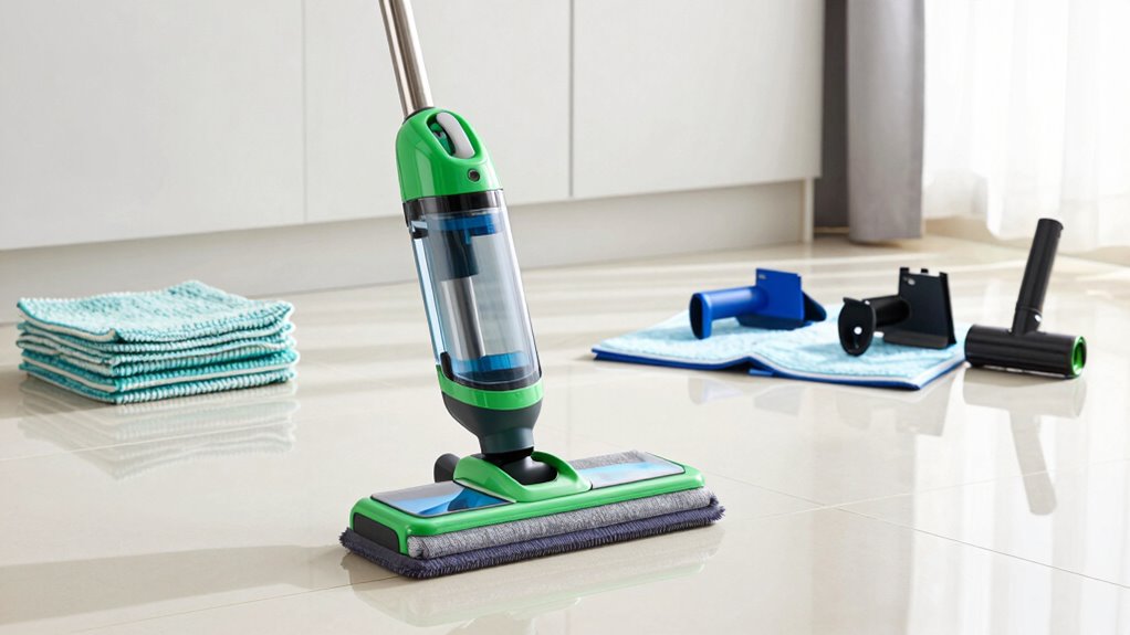 When selecting a premium steam mop, paying attention to tank capacity and run time can make a significant difference in your cleaning experience. A larger tank, 550ml or more, means you can clean longer without stopping to refill. Some models offer up to 45 minutes of continuous steam, ideal for big jobs. Removable water tanks make refilling quick and easy, helping maintain consistent steam output. Efficient designs optimize water use, extending cleaning sessions while reducing waste. Transparent tanks let you monitor water levels easily, so you know when a refill is needed. Overall, a bigger tank combined with longer run time allows for uninterrupted cleaning, making your chores more efficient and less frustrating.