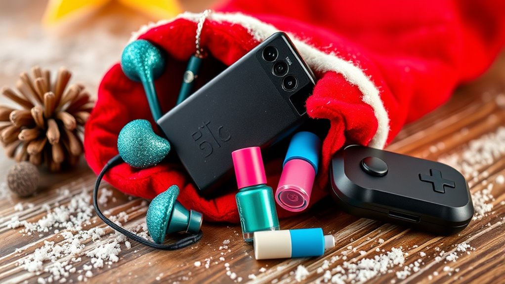 Staying in tune with current teen trends is essential when selecting stocking stuffers for 2025, as it particularly boosts the chances that they’ll be appreciated and actually used. Knowing what’s popular—like eco-friendly products, tech gadgets, or pop culture references—helps me pick gifts that feel fresh and relevant. Incorporating trendy designs, colors, or motifs ensures the gift looks modern and appealing. Keeping an eye on social media trends is a great way to spot what accessories, toys, or gadgets teens are into right now. Additionally, choosing items that align with emerging lifestyle trends, such as self-care or sustainability, resonates with teen values. When I consider these factors, I can confidently select stocking stuffers that excite and engage teens in 2025.