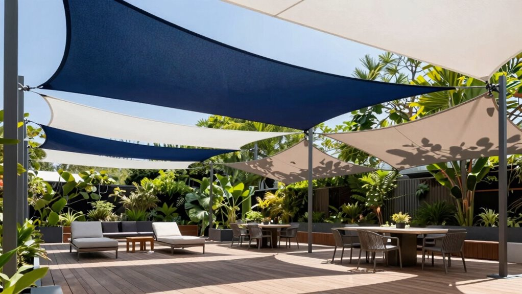 Choosing a premium sun shade sail means prioritizing material durability and quality to guarantee it withstands outdoor conditions. High-quality sails are made from 185GSM or higher-density HDPE fabric, providing strength and UV resistance. Reinforced stitching seams and stainless steel D-rings are essential, preventing tearing and ensuring the sail remains secure over time. Premium fabrics resist fading, fraying, mold, and mildew, keeping their appearance and functionality intact. Durability is further improved by curved edges and double-webbing corners, which distribute tension evenly and prevent sagging or ripples. Additionally, selecting materials with UV protection ratings of 95% or higher assures effective shading and long-term resistance to sun damage. These factors collectively guarantee that your shade sail remains reliable and attractive season after season.