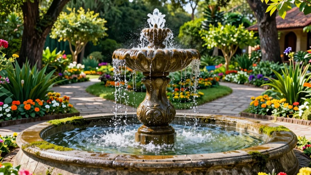 The water flow feature plays a crucial role in shaping the overall look and feel of your outdoor fountain. The flow rate influences both visual appeal and sound, with gentle streams creating calming sounds and stronger flows delivering a dramatic effect. Adjustable pumps let you customize the water speed, helping you achieve the perfect balance of sound and movement. Uniform and cascading streams enhance a natural, peaceful aesthetic, often through multi-tiered designs or well-placed outlets. It’s also important to minimize splashing and water wastage by controlling flow patterns. Proper placement of outlets and flow regulators allows you to manage water trajectory, volume, and overall performance, ensuring your fountain looks stunning and operates efficiently over time.